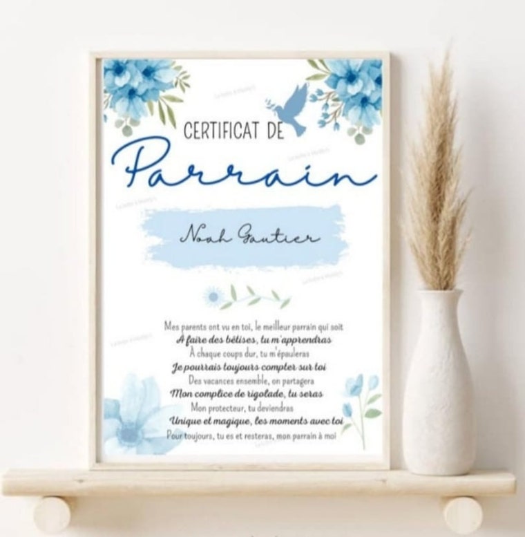 Certificat de parrain avec nom et prénom de l'enfant ou du parrain, au choix. -
