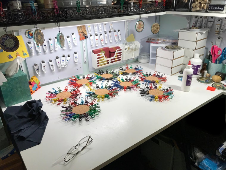 So that’s the story of Lark’s Hollow. After creating my new coasters I got inspired by the other sizes of bevels available and expanded to ornaments, magnets, and pendants. It always makes me happy when someone compliments a pendant I’m wearing and I can tell them that I made it! My pendants are true beveled glass – not your run-of-the-mill premade pendant kit.