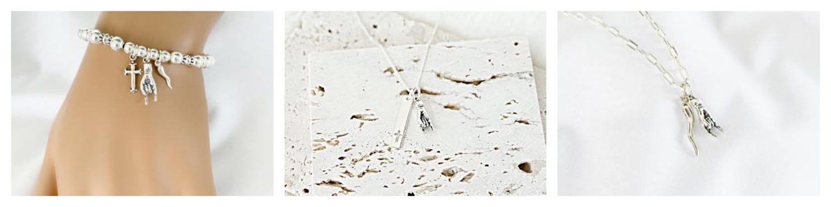❤︎ Ich verwende Materialien wie Perlen, Edelsteine, 14-karätiges Gold und Sterlingsilber. Sollte etwas plattiert sein, informiere ich Sie in der Auflistung darüber. Zu den Anhängern gehören italienische Hörner, Mano- und Figa-Hände sowie heilige Symbole. Jedes Design fühlt sich wie ein Erbstück an – tragbare Geschichte, erfüllt von Geist und Geschichte.