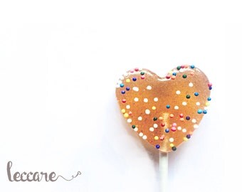 Our LolliTots measure 1 1/2 inches wide and are just at 1/4 inch thick. Our Original Hearts measure 1 1/2 inches wide and are just under 1/2 inch thick. All our lollipops come on a 5 1/2 inch stick.