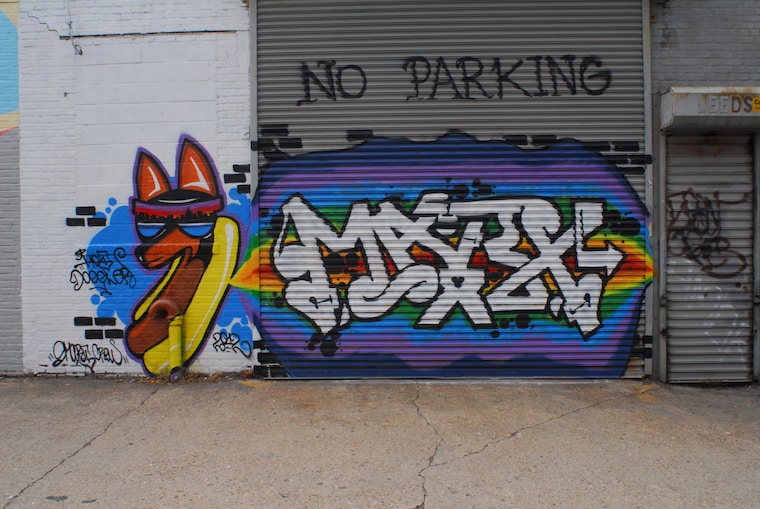 Outside. A mural I commissioned. Yes, that's a Chihuahua in sunglasses and hotdog bun.