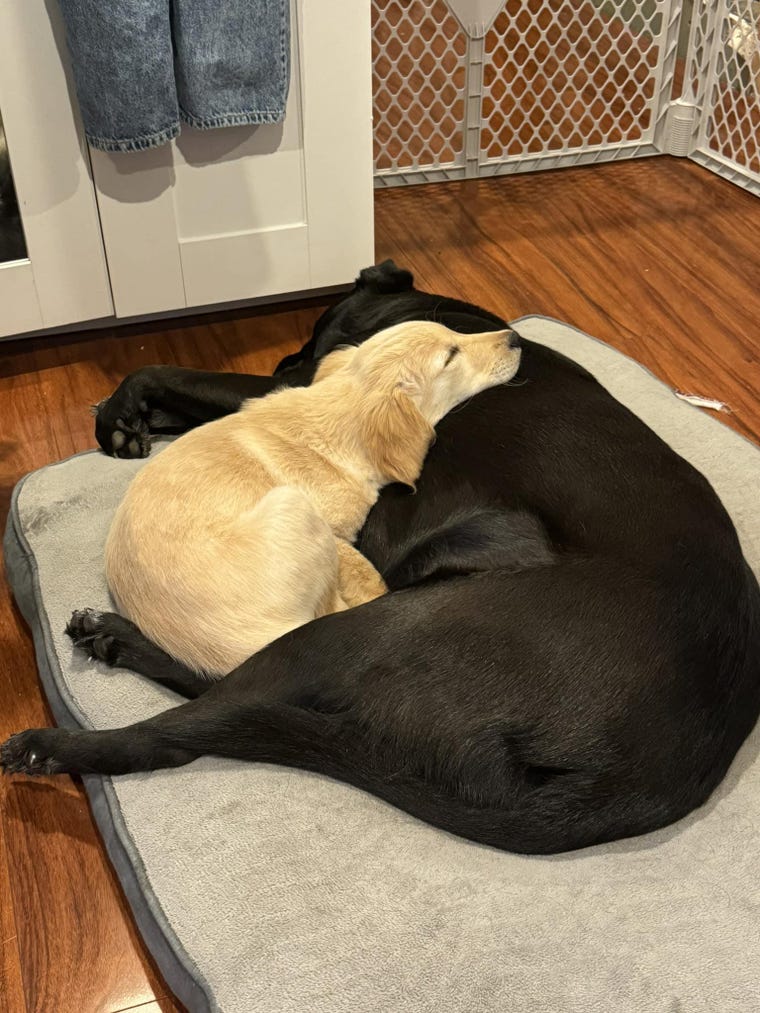 Maeve with Zeus, our son's black lab. Break time is for napping! -