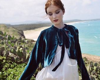 Our velvet blend is shimmery, thick and dense, weaved of silk - viscose with a bit of spandex for the stretch.