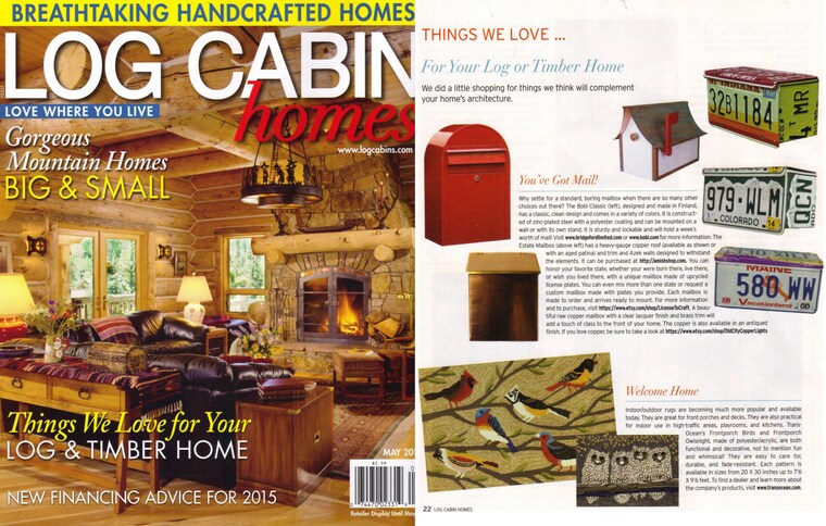 * Unsere Nummernschildbriefkästen wurden in der Mai-Ausgabe 2015 des Log Cabin Homes Magazine vorgestellt *