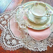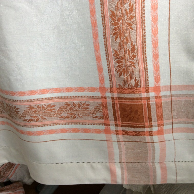 I am crazy about 1920s color damask linens. Colors are amazing. Patterns really pop. And damask is reversible. -