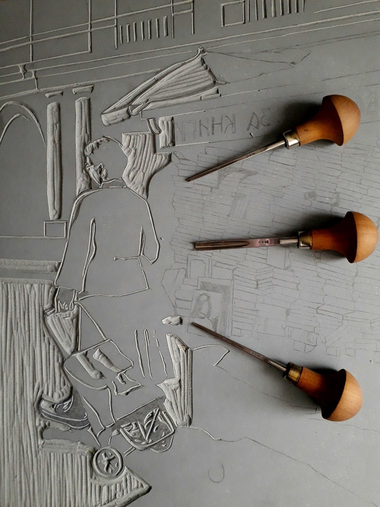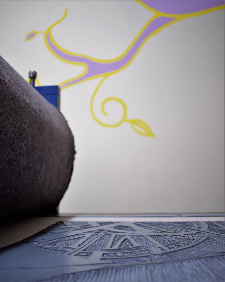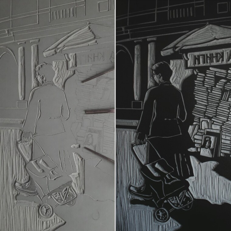 During my own studies at the Academy, I developed a passion for a specific printing technique- the linocut technique. It started with the motives of dark streets and grew to a nearly one square meter big abstract prints. And there it stopped, and my interests turned to other techniques.