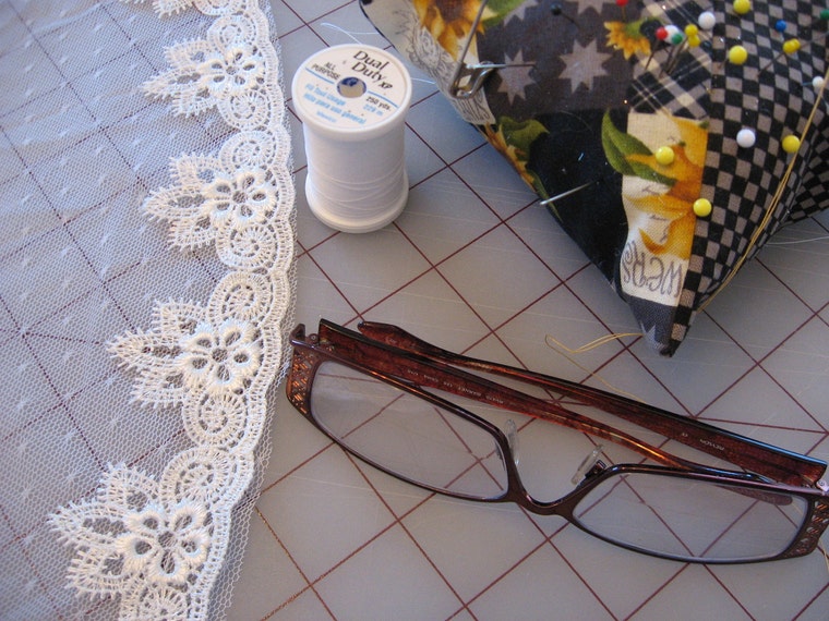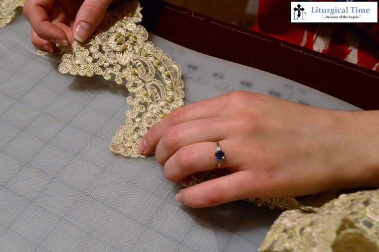 For us, this is contemplative work. I find repetitive stitching to be an excellent vehicle for contemplative prayer. We also pin the name of the recipient on the each veil as soon as the lace is cut. That name follows the head covering through to completion, allowing us to pray for the recipient every time her veil is in our hands.