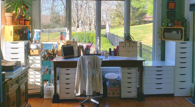 I occupy a number of spaces in my home for my art business. This one is a sunny corner of my kitchen and where I create. -