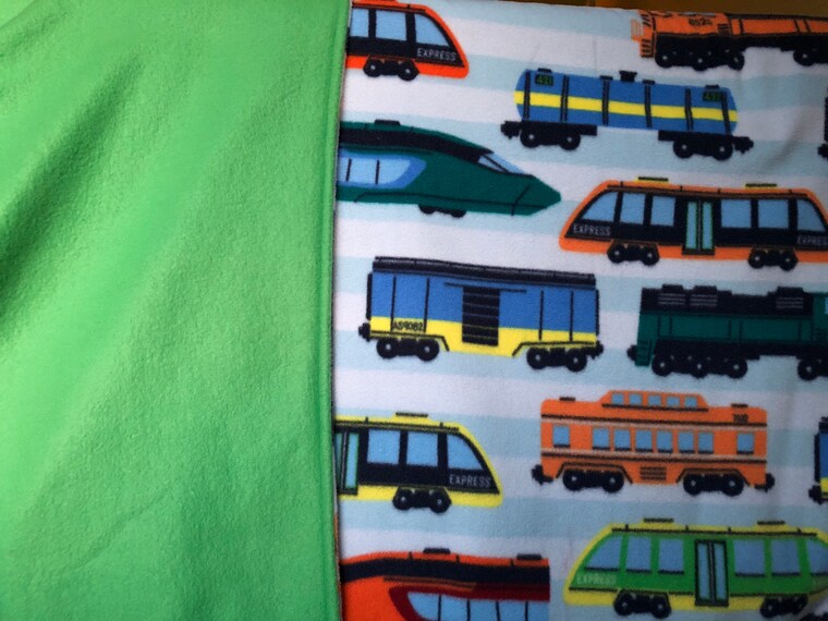 My son insisted on having a train fleece throw! -