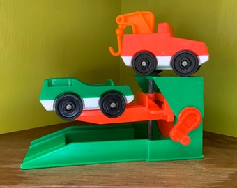 Fisher Price Little People Car, Tow Truck and Mechanic Lift Lot - vintage Fisher Price vehicle lot - green and bright orange - Car Lift FPLP