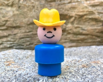 Vintage Fisher Price Little People Farmer Figurine - blue body yellow triangle scarf farmer with yellow cowboy hat - 1980s plastic FPLP