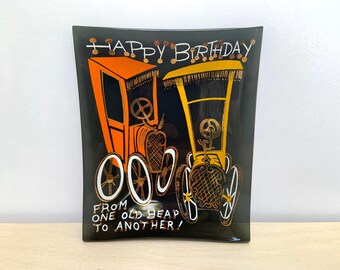 Vintage “Happy Birthday From One Old Heap to Another” Collectible Glass Dish by Houze Art - smoked glass retro dish - antique car art