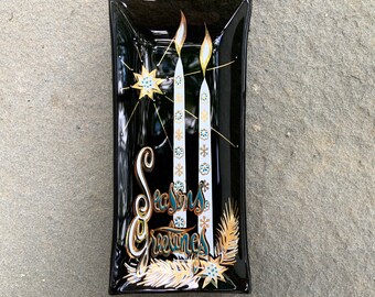 Vintage “Season’s Greetings” Collectible Glass Dish by Houze Art - smoked glass retro dish - candles and retro font Christmas decor
