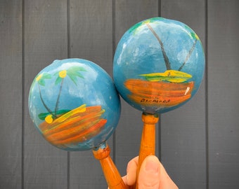 Vintage Bermuda Coconut Maracas - Bermuda souvenir - hand painted maracas - blue and brown palm tree scene - Vintage Travel Mrmorabilia
