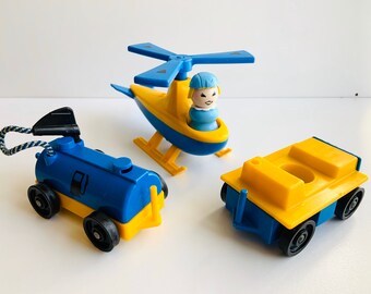 Blue and Yellow Jetport Pieces with Stewardess by a Fisher Price - fisher price little people helicopter, fuel tank and car 1980s