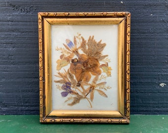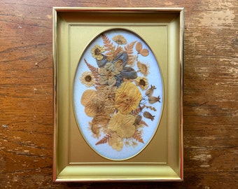 Miniature Pressed Flower Collage in Gold Frame - by Virginia Cole - botanical art - preserved flowers in frame - vintage pressed flower art