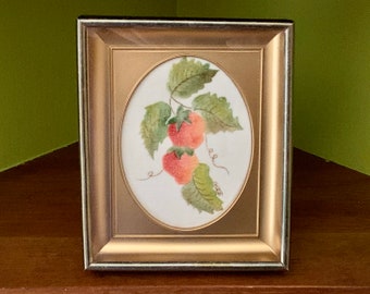 Vintage Strawberry Painting on Fabric in Gold Frame - signed RWM - strawberry plant art - vintage fruit painting