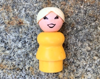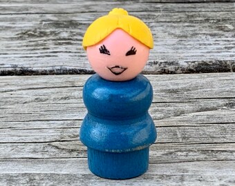 Vintage Wooden Body Woman with Yellow Hair - Fisher Price Little People 1970s - blue wood body - Wood Body Little People Mom