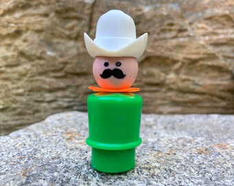 Vintage Fisher Price Tall Cowboy with Mustache and Ten Gallon Hat - green body orange scarf large white cowboy hat Little People