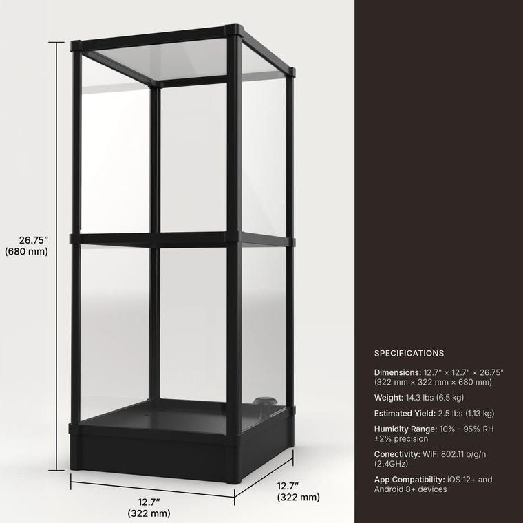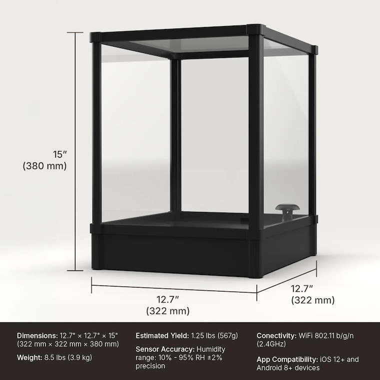 Our chamber takes care of the details — controlling humidity, fresh air exchange, and light cycles automatically through the LYKYN app. Just choose your mushroom type, and the system guides you from start to harvest.