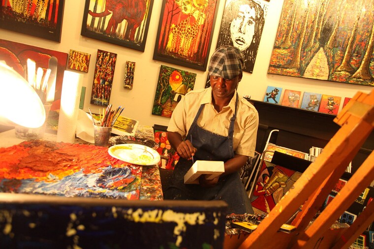 M. Sani is a self-taught Artist. None of the schools he attended offered art classes, so he learned how to paint from inspiration around him. When asked were the inspiration comes from, Sani answered, " My inspirations come from my dream and sometimes I just need to observe the nature. Each of my painting tell history you just need to observe and listen.” Sani’s paintings have been described as bold, abstract, primordial. He uses watercolor, oil, acrylic, as well as mixed-media such as wood, glass, paper, canvas, leather, collage. He also sometimes uses clay and papier mache to create forms such as masks. His rich culture and people serve as subjects to his works. Some important themes to his work are the spiritual influence of religions, tribal ceremonies, and music. At home he was known as the "lord of the dance" and it is evident that he still is by his paintings of jazz musicians.