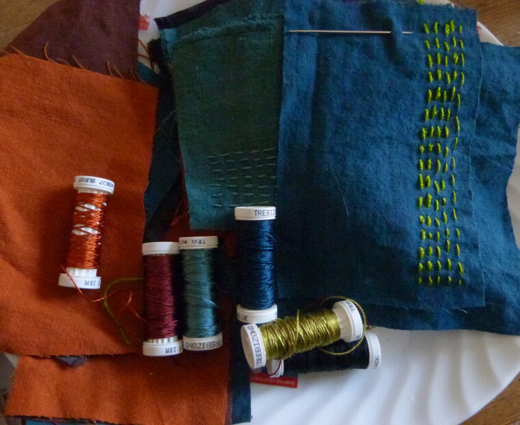 My garden and nearby landscapes provide lots of inspiration for my projects, as do textile patterns, fine artwork, and mundane objects ... you never know when a color combination will strike you as interesting! Sometimes the color combinations appear when I'm cleaning up the studio, and other times I sit and sort, try this color, then another, edit and re-arrange until the mix is satisfying and eye-catching.