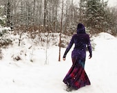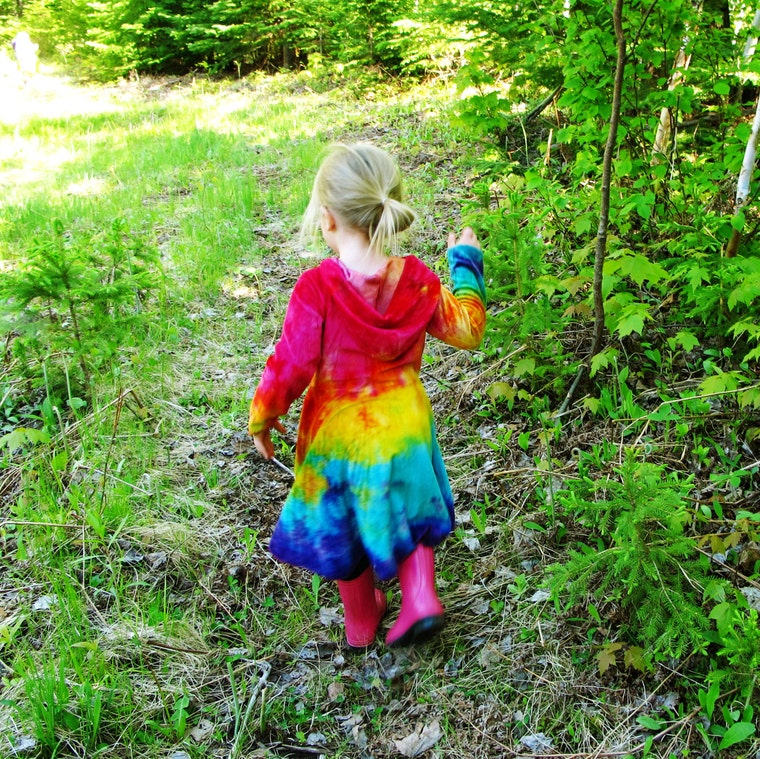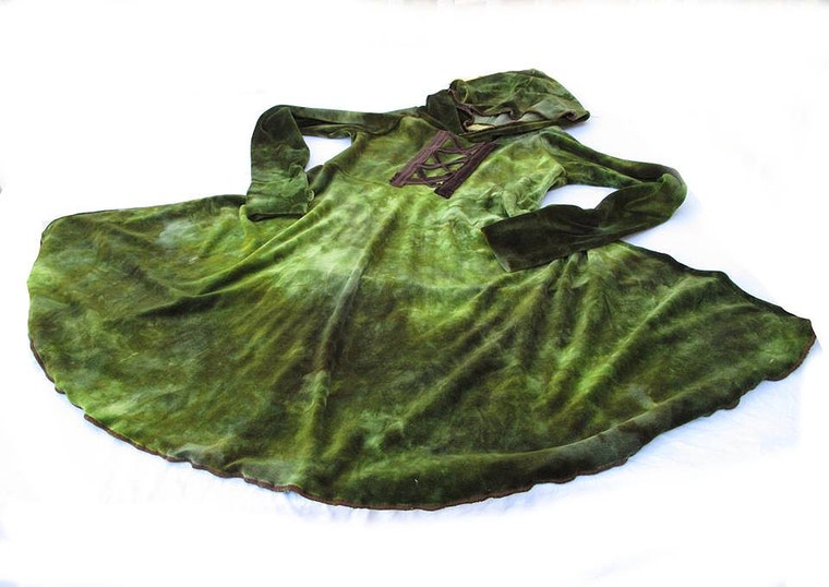 A few years ago, shortly after I had begun my adventure with fabric dyeing, a friend told me about a dress she bought for her daughter years ago from a handmade seller. She said it was a hooded dress, made of a thick, weighty hemp fabric, with a beautiful skirt for spinning, and it was dyed in a rainbow gradient. She was asking on our “mommy forum” if anyone knew of someone who could make such a thing, as the original shop was gone.