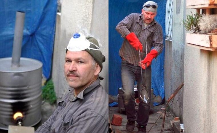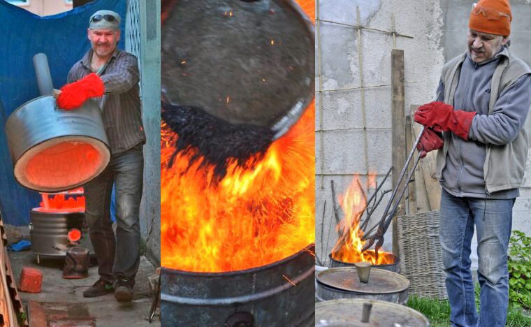 Ik gebruik verschillende soorten Raku klei. Ik meng vaak lokale Neder-Silezische klei met chamotte, afhankelijk van het soort item of effect dat ik wil bereiken. Soms voeg ik ook kleistoffen van mijn vrienden toe van hun reizen - rode grond uit Namtso in Tibet, klei uit Oost-Bhutan of zand uit Oman en Jordanië. Ik vorm de klei met mijn handen zonder een pottenbakkerswiel of een mal te gebruiken. Nadat de klei is gevormd, laat ik het een paar dagen drogen. Terwijl het kurkdroog is, stook ik het in de gasgestookte oven. Dit eerste stoken wordt "bisque" genoemd. Ik versier bisque stukken met glazuren die speciaal voor dit specifieke item zijn gemengd, wat resulteert in een unieke kleurbehandeling, en ik vuur ze opnieuw in temperatuur - ongeveer 1000 C (1832 F). Daarna worden items roodgloeiend verwijderd en in containers met brandbare materialen (zaagsel, papier, droge bladeren) geplaatst, wat de atmosfeer vermindert - gebieden die niet zijn geglazuurd, worden zwart. Dit proces genereert ook haardunne scheuren in het glazuur, zogenaamde "craquelés", en als glazuur veel koper bevat - metaalachtige glinsterende kleuren. De items worden vervolgens getemperd in koud water en gereinigd met een schuurmiddel om alle roet- en asresten te verwijderen.