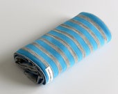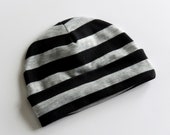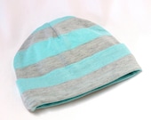 5 out of 5 starsshipped fast, I got the 12-18 month for my 6 month old and it fits with room to grow. This one is softer and stretchier that the navy blue jersey knit - I like that it is softer, but it feels also thinner so I use this under baby's hoodies. If I were to just put one hat on, I would choose the navy blue hat material for windy days.