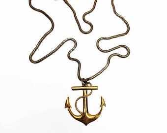 1970's Anchor Pendent Necklace. Tube Chain in Gold Tone. Vintage Fashion.