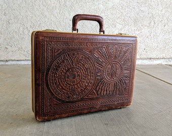 1980's Leather Mayan Calendar Briefcase. Hand Tooled w/ Brass Hardware.