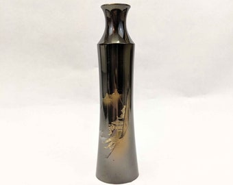 1980's Japanese Etched Bud Vase. Highly Polished Black and Bronze Finish.