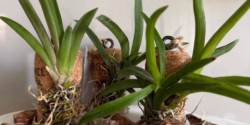 Yes! Our reclaimed wine and champagne corks are chosen for their durability and porous nature, which mimics how orchids grow in the wild. The orchid’s roots will eventually "climb" and anchor themselves to the cork. You do not need to repot it; simply follow the care instructions provided