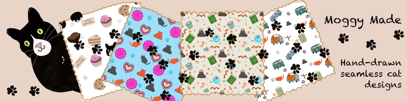 Unique, hand-drawn seamless patterns featuring cats in cosy, playful and creative little worlds...