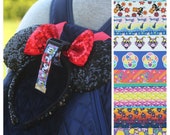Our ears are already made. We can not pick out specific characters of the fabric and put them on each ear. Please do not put directions in "notes to seller" for what you want on each ear. If you would like a custom pair of ears please MESSAGE us and we can make you new ones if we have excess fabric available. Notes to seller with no prior discussion of customization will cause your order to be delayed or cancelled.