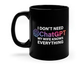 5 out of 5 starsI recently purchased a mug with the text "I don't need ChatGPT, my husband knows everything" and I am absolutely delighted with my purchase. I was looking for a fun and playful mug that would make me chuckle in the morning, and this one definitely delivered. Overall, I highly recommend this mug for anyone looking for a quality item that matches the description and meets expectations. I'm very happy with my purchase and would definitely buy from this seller again in the future.