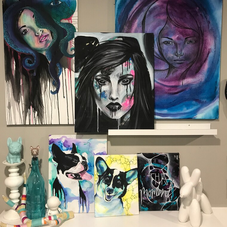 My business began to grow, and so did my family. I welcomed my second daughter just one year later and have watched her and my business blossom before my eyes. Slowly my art has evolved from sock monkeys (hence the Mushtushy name, representing the mushy squishy sock monkeys) into pet art, license plate art, and back to my true passion ....abstract acrylic canvas paintings inspired by water, women, and organic shapes.