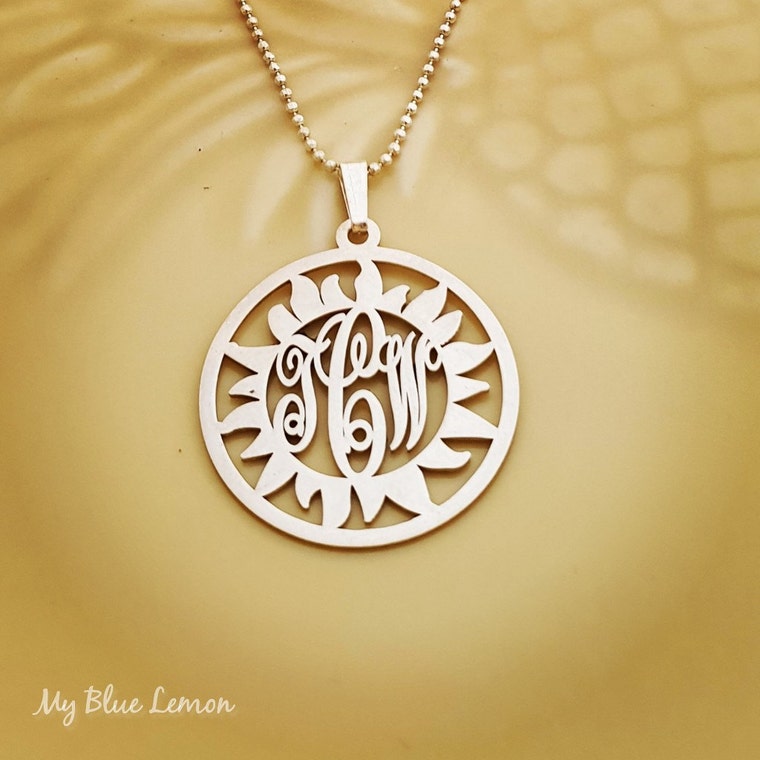 This is my new Sun Design with your Monogram in the center! Available in Sterling Silver, Solid Gold, and Gold Plated!