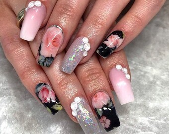 floral print 'black with pink rose and floral pattern Nail art water decals