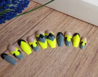 Grey and neon yellow geometric press on nails, fake nails, gel nails