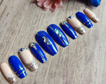 Royal blue and gold press on nails, fake nails, bling, gel nails