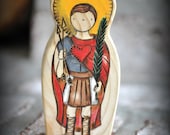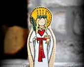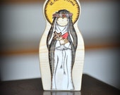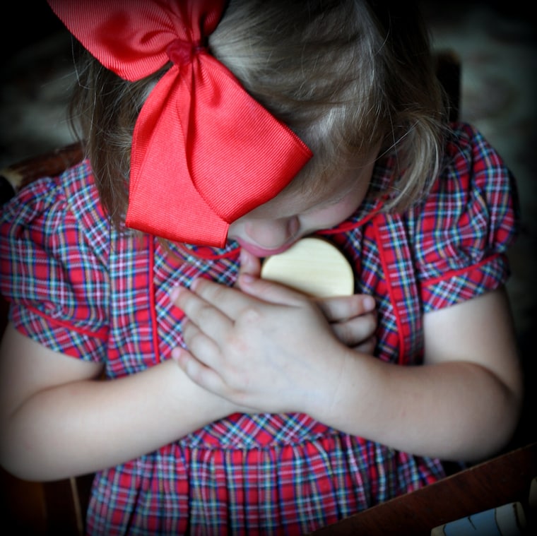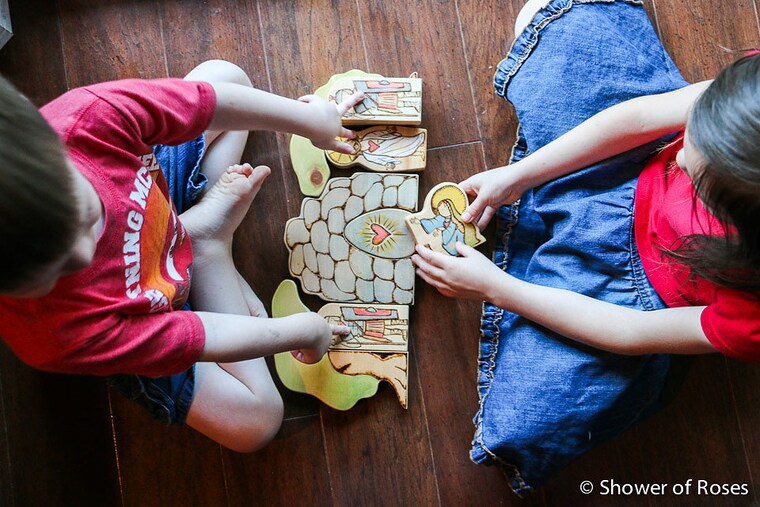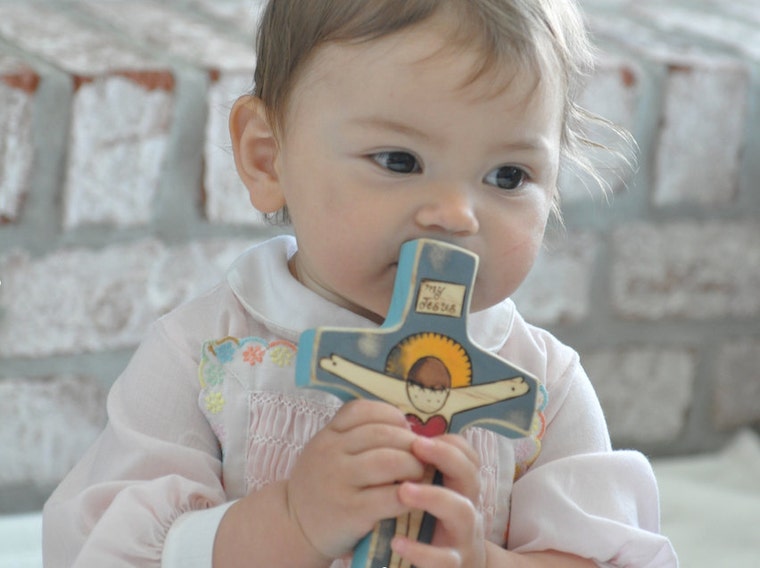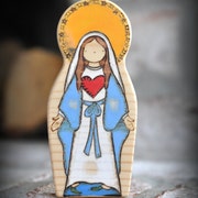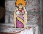 We have found in our own babies and toddlers a natural embracing of things spiritual. Inspiring devotion from the youngest of ages, our toys encourage loves and kisses. Recently our toddler made a sort of shrine out of large legos, placed her wooden crucifix inside, and promptly taught her baby brother to kneel and bow in front. Beautiful. All of our pieces are individual works of art. No one piece is exactly alike! Our products are custom handmade, natural, beautiful, safe, and toddler tested. Our toys are sure to inspire love and devotion snd hopefully become a family heirloom! With each item, we spend a lot of time designing and hand-cutting our own patterns, sanding to a smooth silky finish so all the edges are rounded, wood-burning every little detail in place, then adding the wonderful colors with a non-toxic homemade milk paint, using a wash to penetrate the wood, so the beautiful grain will show through. We hand rub in a wonderful smelling homemade natural beeswax wood polish to protect the toy and bring out the vibrant colors. Perfect for little hands and lots of loving kisses! Each item comes with a card that says our family has prayed a Divine Mercy Chaplet for the recipient.