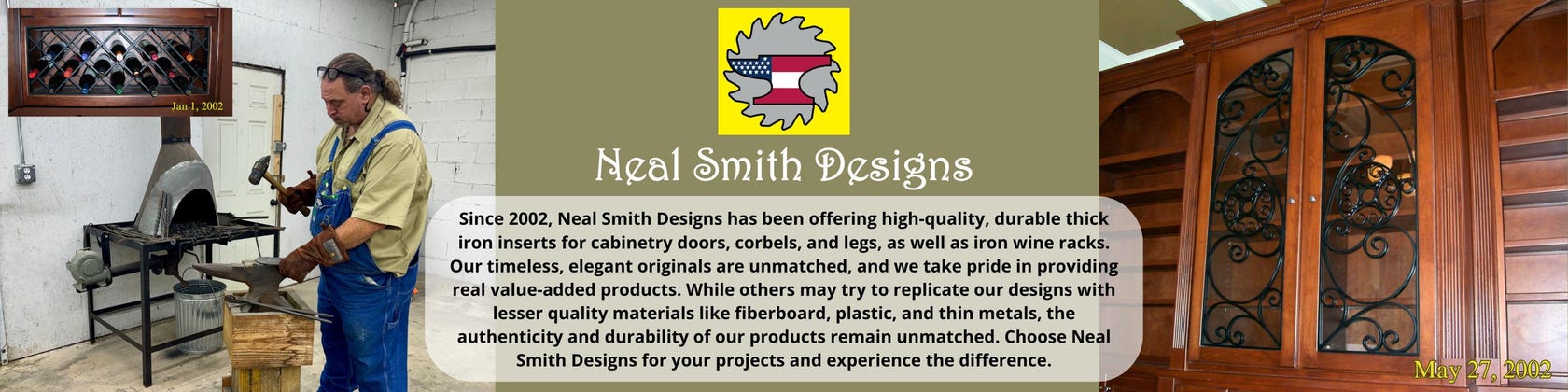 In the mid-80s, I developed an interest in metalworking as a hobby. By the late 90s, I had mastered welding, metal fabrication, forge work, and various other aspects of metalwork. I began creating iron panels for cabinet doors and incorporating iron into corbels for bar overhangs, which received positive feedback from customers. This led me to establish Neal Smith Designs in 1998.