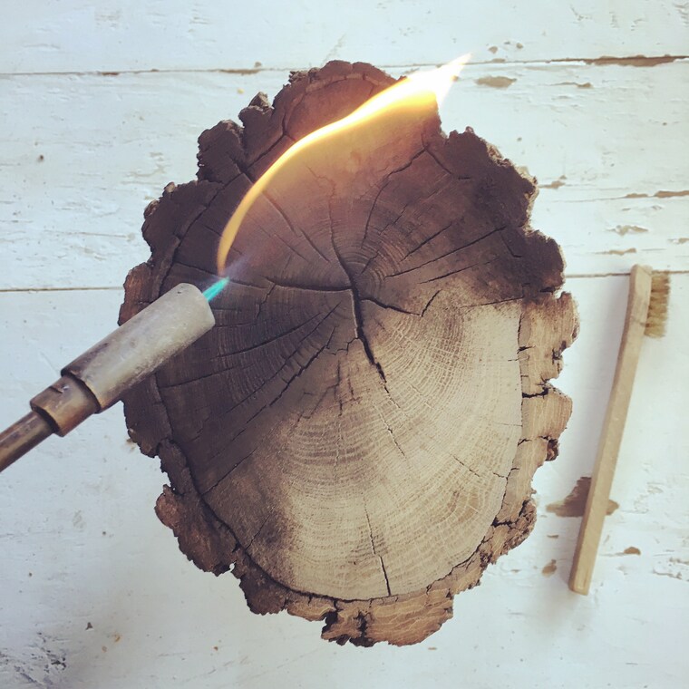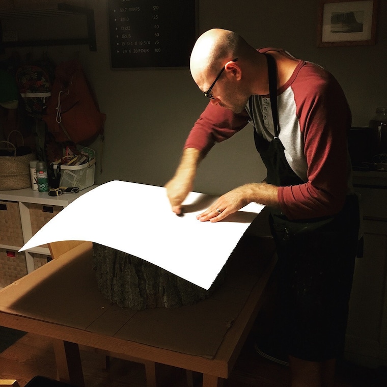 Diversi anni fa i nostri vicini della porta accanto avevano un'enorme quercia abbattuta per errore. La società di rimozione degli alberi aveva sbagliato l'indirizzo e non è stato catturato in tempo. L'albero aveva più di 100 anni ed è stata un'enorme delusione per loro e per noi. Il legno è stato tagliato e i nostri vicini lo hanno tenuto nel loro cortile. Un paio di anni dopo, si sono trasferiti sull'isola di Vancouver e ci hanno regalato il resto del bosco. Fu allora che Darren ebbe l'idea di provare a fare una stampa come un modo per creare una sorta di ricordo e regalo per loro. Aveva visto qualcosa di simile e voleva provarlo. La nostra prima stampa è stata fatta esclusivamente da Darren (ora io, Pam, mi sono unito al processo) e lui ha fatto solo 4 stampe. Uno è stato spedito all'isola di Vancouver ed è arrivato per la mattina di Natale sulla soglia del nostro ex vicino.