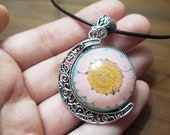5 out of 5 starsWonderful quality! I'm always looking for more whimsical, floral and/or lunar themed jewelry & this was absolutely perfect. I may replace the cord because I'm picky like that, but it works just fine as is. Shipping was super fast, which I'm always grateful for.