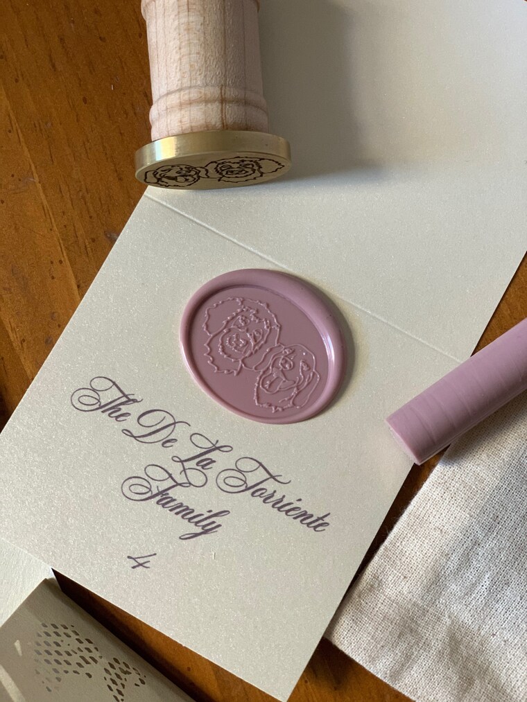 Pet Portrait Wax Seal Detail in Rose Colored Wax on a cream colored Escort Card (Wedding) -