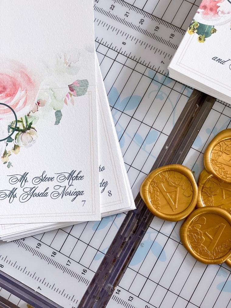 Production of some Watercolor Floral Escort Cards with an adorning Monogram Wax Seal in Gold (Wedding) -