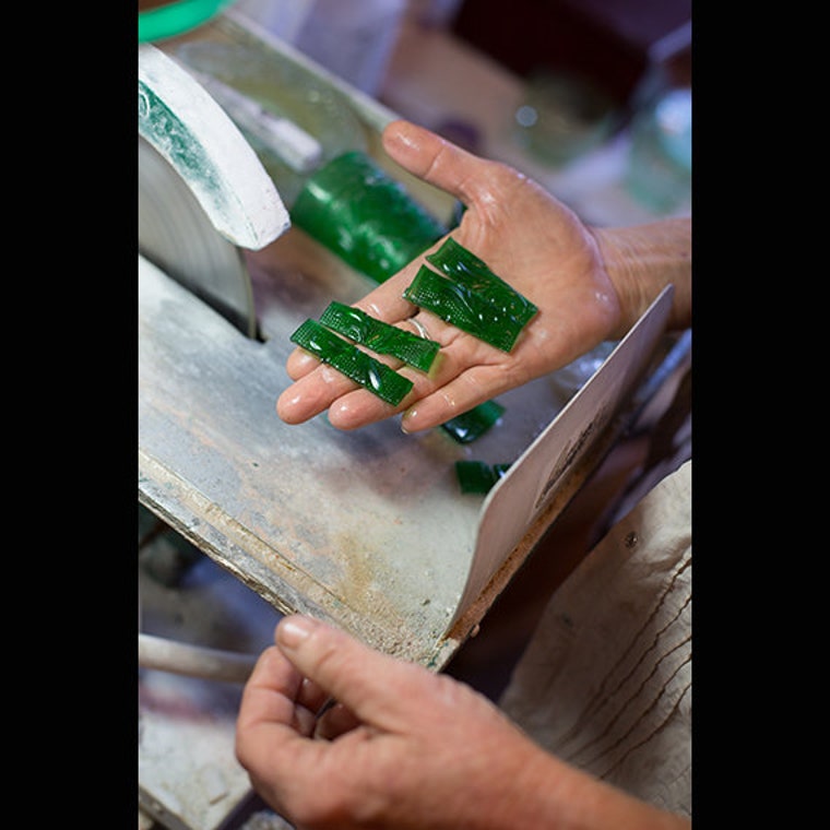 Each glass creation is hand cut and shaped to highlight and present the color, etching or pressed glass design. There is artistic thought and vision, as well as specialized tools and equipment, making each creation truly unique.
