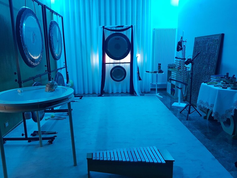 Nella Sala dei Suoni di Ottavaperla a suonare alcuni dei 6 gong presenti -