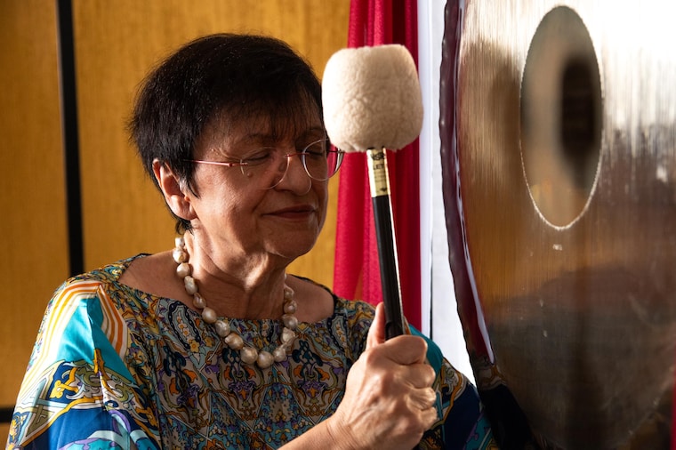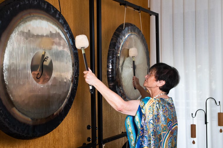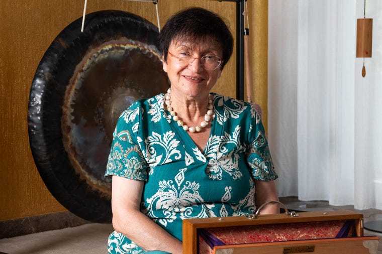 Maria Rita Piva leads gong bath and integrated sound therapy sessions. After nearly 40 years of teaching, she combines sound, voice, and silence in research, training, and writing dedicated to healing and presence.